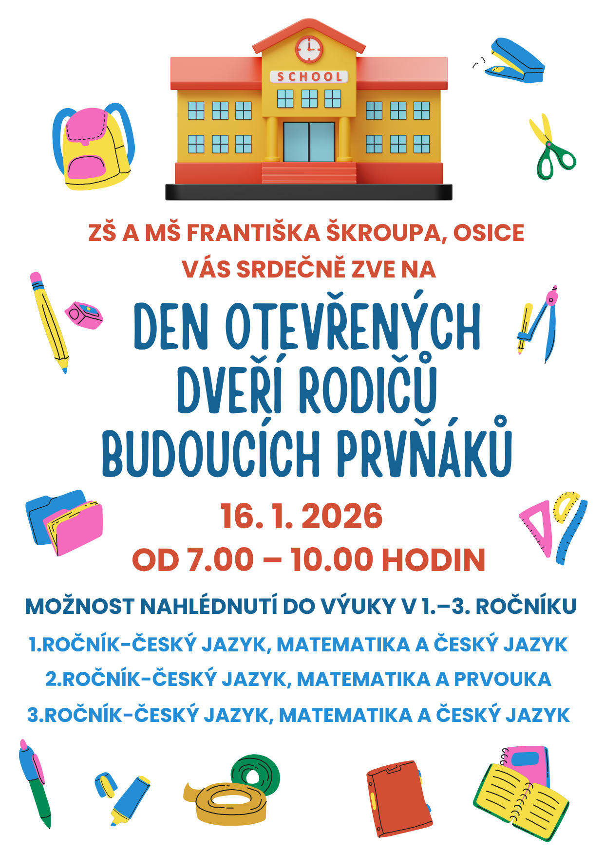 srdečně Vás zveme na Den otevřených dveří pro rodiče budoucích prvňáčků, který se uskuteční 16. 1. 2026 od 7:00 do 10:00 v naší škole.