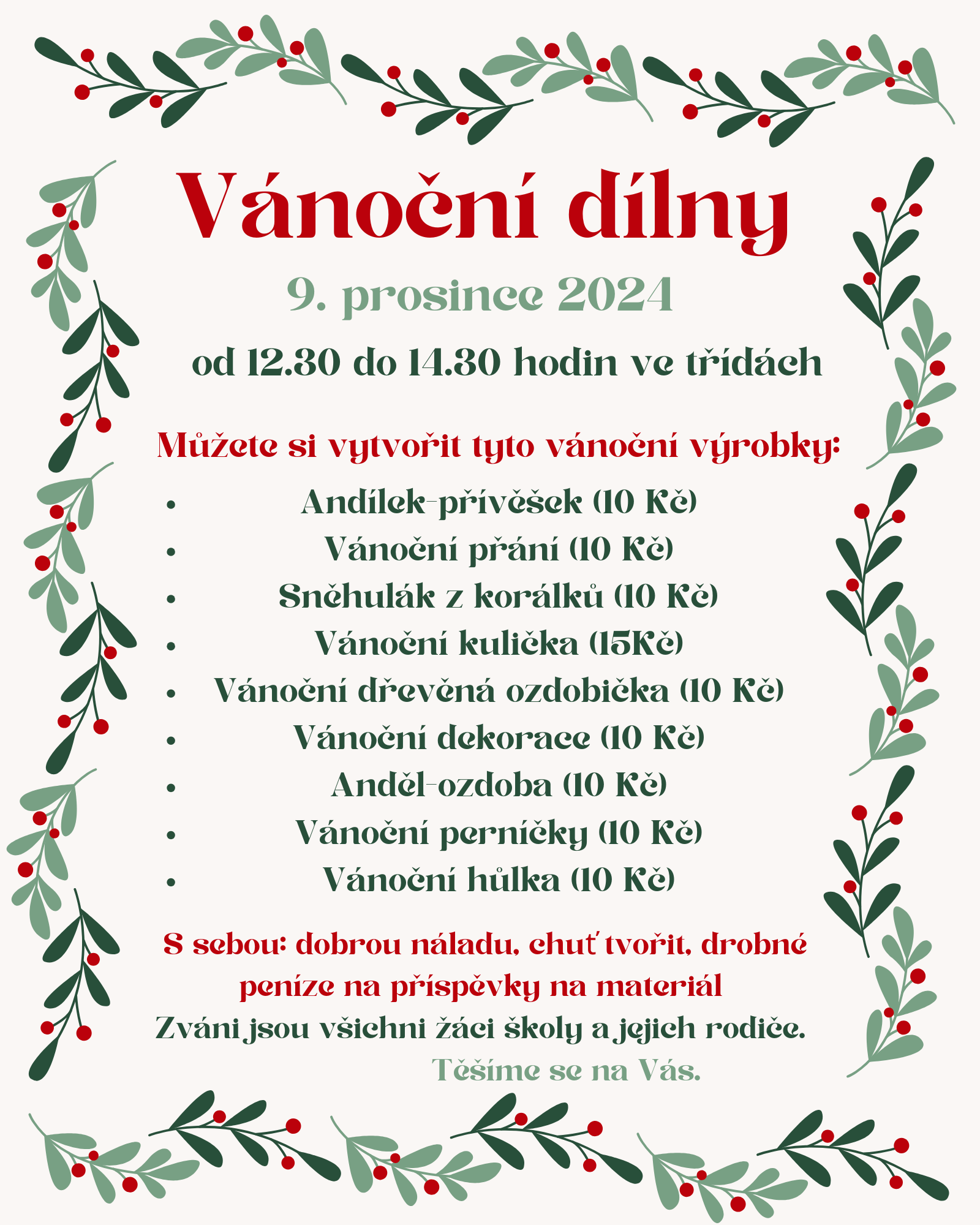 přijďte si s námi užít kouzelnou vánoční atmosféru a vyrobit si krásné vánoční výrobky, které vykouzlí úsměv na tvářích vašich blízkých.